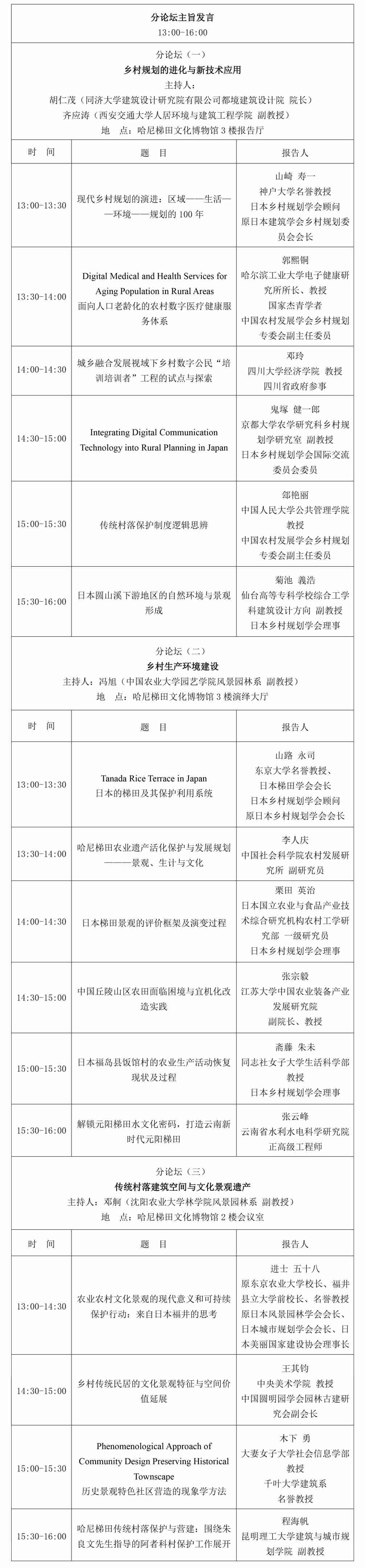 (首届)中日乡村规划学术研讨会,分为“中日乡村规划与文化遗产保护实务论坛”和“中日乡村规划学术研讨会”两个部分。于11月18日下午和19日全天在哈尼梯田文化博物馆报告厅举办。11月18日下午召开的实务论坛由“农业农村文化遗产保护与传承”和“乡村规划实务问题与对策”两个平行论坛组成,西安交通大学人居环境与建筑工程学院副教授齐应涛、京都大学农学研究科乡村规划学研究室助教东口阿希子等18位来自中日两国的嘉宾在论坛上发言。